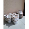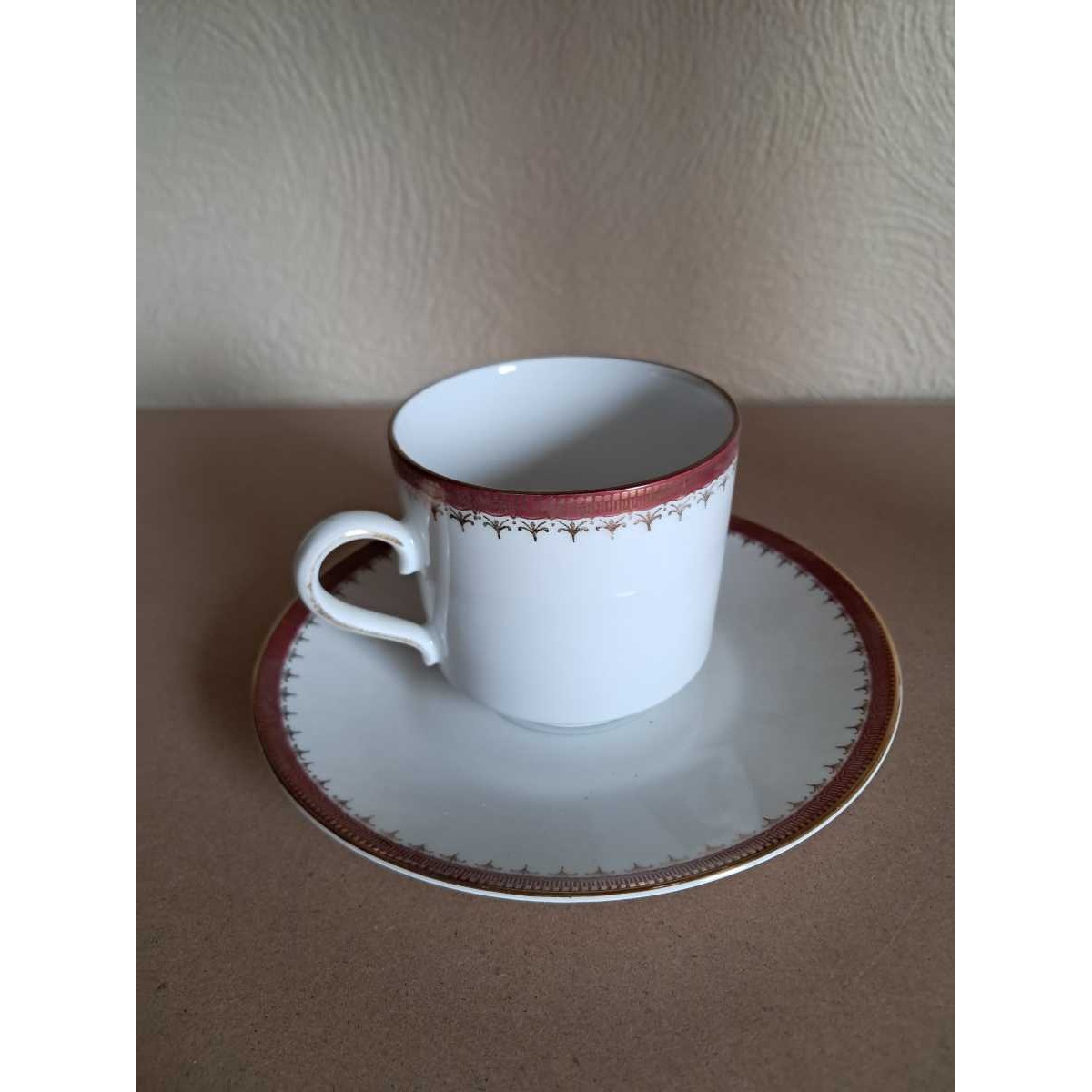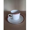 Een set van 6 porseleinen tassen met rode rand + bordje.