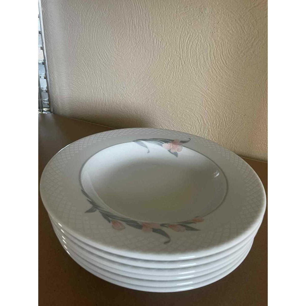 Een set van 6 grote porseleinen borden met roze bloemetjes.